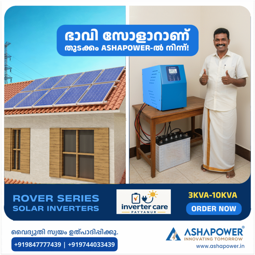 As an authorized ASHAPOWER dealer in Kasaragod, Inverter Care Payyanur supplies and installs every model in the ROVER Series—tailored for Kerala’s voltage conditions and designed to perform perfectly in both homes and businesses.